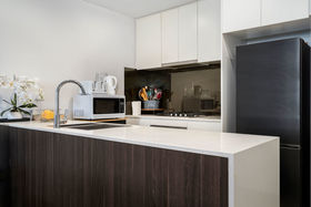 * Stylish kitchen with gas cooktop, sleek stone benchtops and mirrored splash back